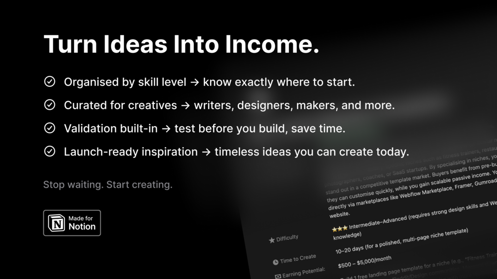 A curated library of 100+ digital product ideas, beautifully organised by category and skill level. No fluff, no filler, just the ideas that help you launch faster.