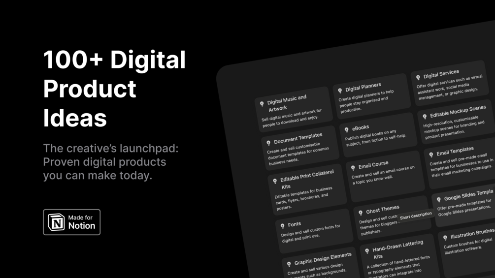 100+ Digital Product Ideas is a curated library of proven, beginner-friendly and advanced product concepts designed to help creatives, freelancers, and entrepreneurs launch faster, validate smarter, and start building digital income with confidence.